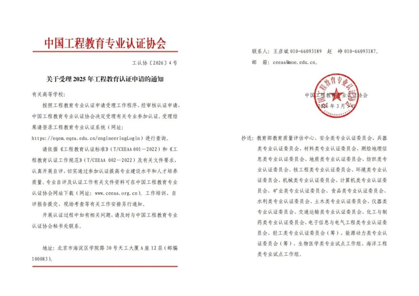 近日,中国工程教育专业认证协会发布《关于受理2025年工程教育认证申请的通知》(工认协〔2026〕4号),我校物联网工程专业获认证受理,标志着我校在工程教育认证上取得了“零的突破”,是我校应用型工科专业建设的又一突破性成果。